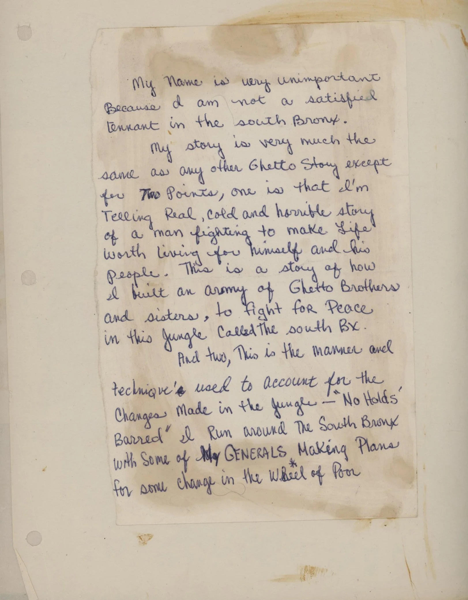 Charlie Suarez, president of the important South Bronx gang The Ghetto Brothers, organized an important meeting between all the gangs for them not to fight each other anymore. My dream is to see his book published, as I deeply admire his writing.